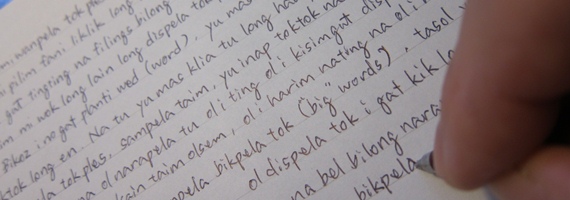 トクピシンの書き起こしの案件もそれほど多いとは思えませんが、これも現地の人との接触がないとたいへん難しいものとなり得ます。国中のかなり多くの人々がトクピシンを話していますが、書かれたトクピシンを見る機会はそれほど多くありません。800以上あるという土着の言語を話す人々が話すトクピシンは、発音、アクセントなどがその地元の言語の影響を受けることがよくあります。ですから、彼らがトクピシンを書くときには、自分たちが発音するとおりに表記する傾向があります。例えば、助け、助ける(英語 help)に相当するトクピシンは、helpim、あるいは、helvim、halvim などと綴られることがあります。種々の、様々な、に相当するトクピシンは通常、kainkain と綴られますが、ある人は、kaenkaen と書きました。おそらくその人自身がそのように発音しているものと思われます。〜してはいけない(Don't〜)は、トクピシンで No ken 〜 となりますが、ある人は、No gen と書きました。確かにその地方ではそのように発音しています。書き起こしの際には、現地での経験がたいへん貴重なものとなります。